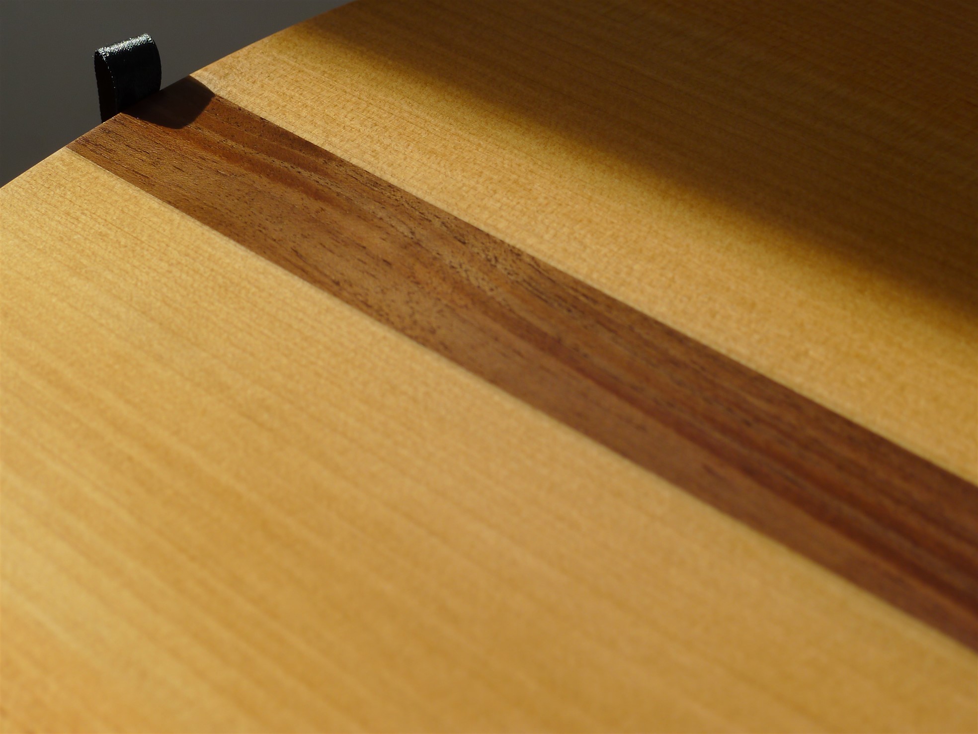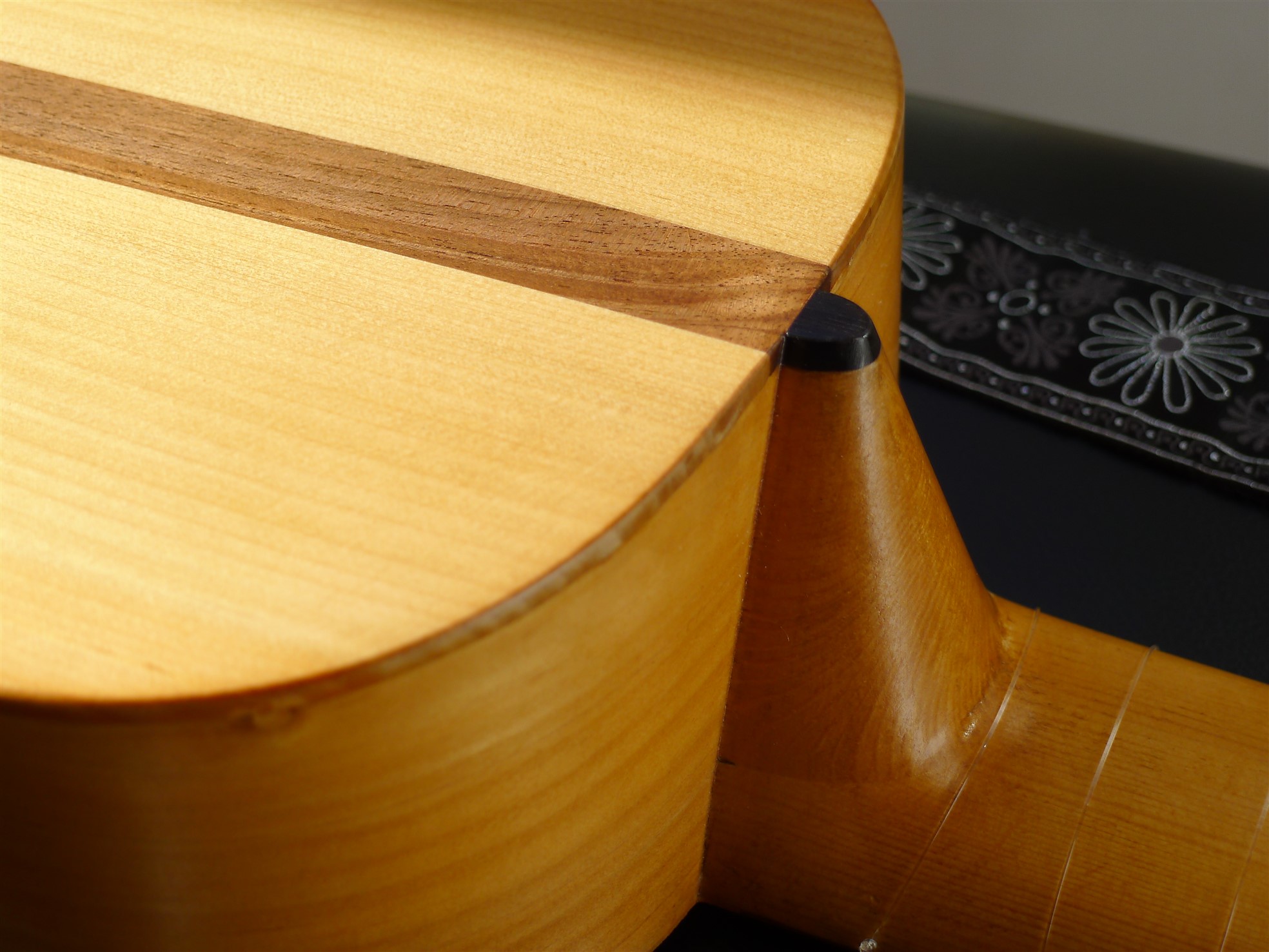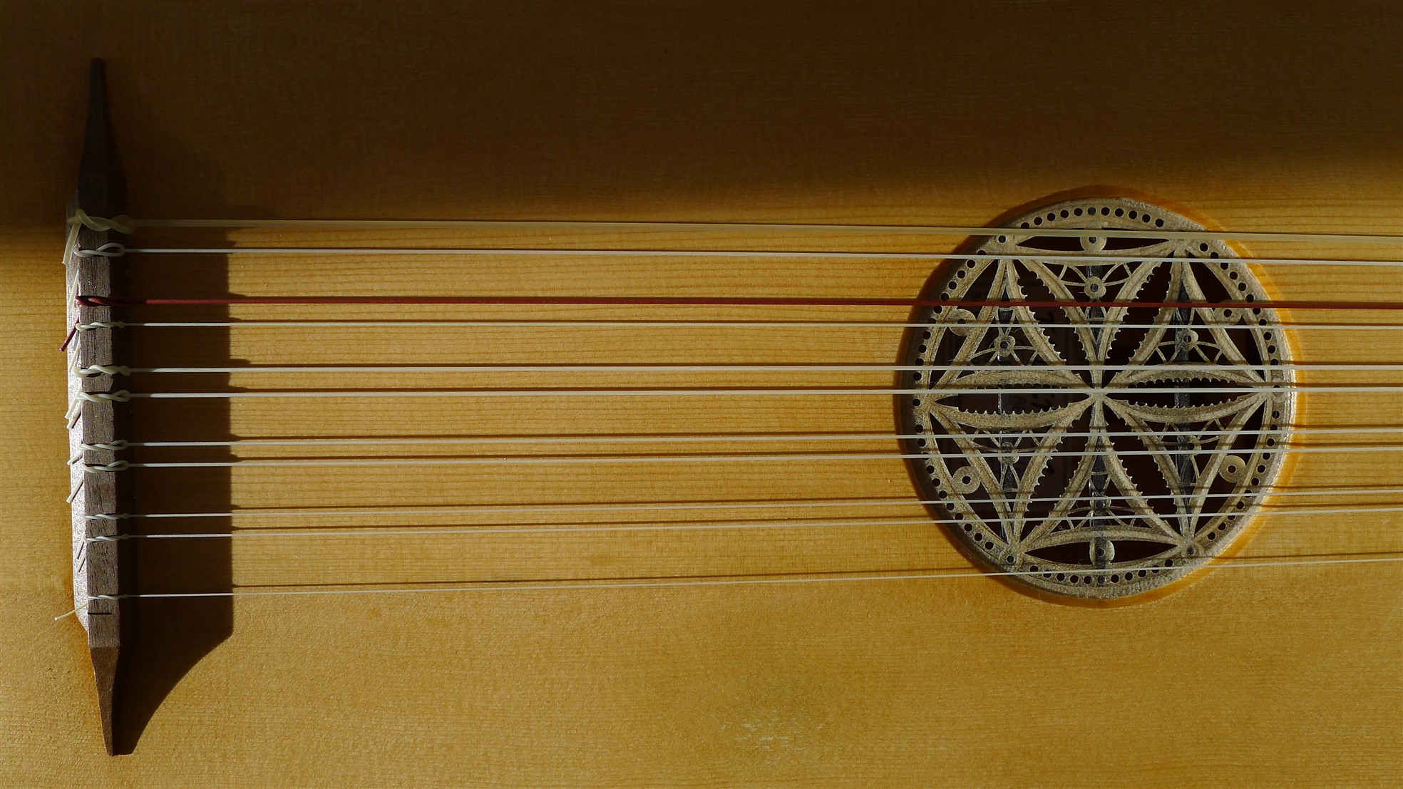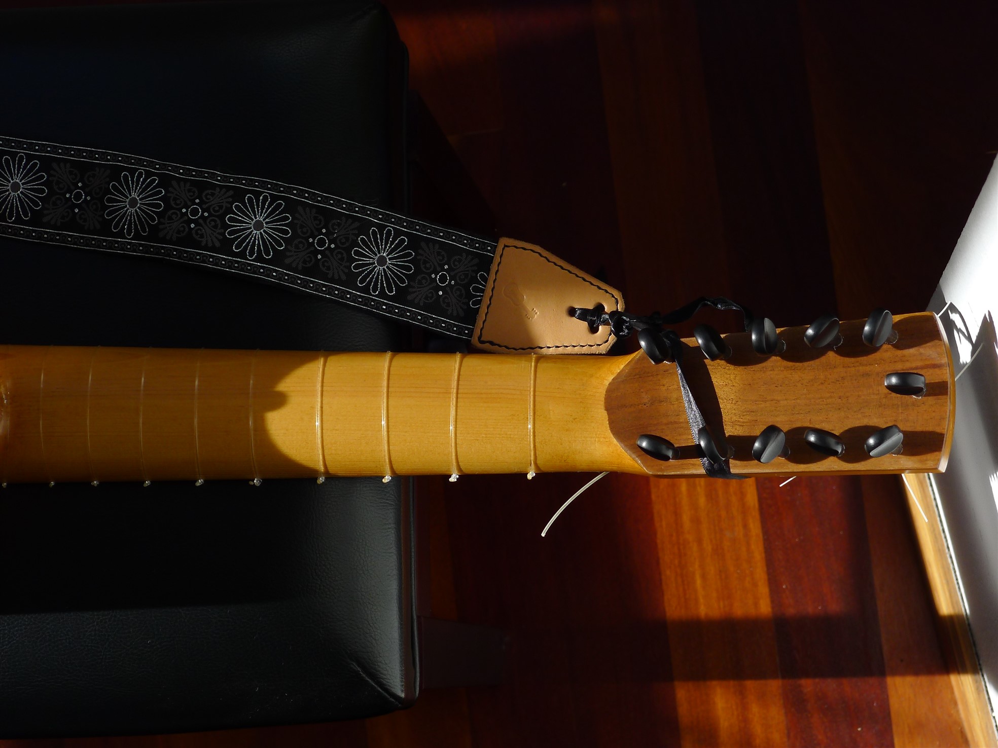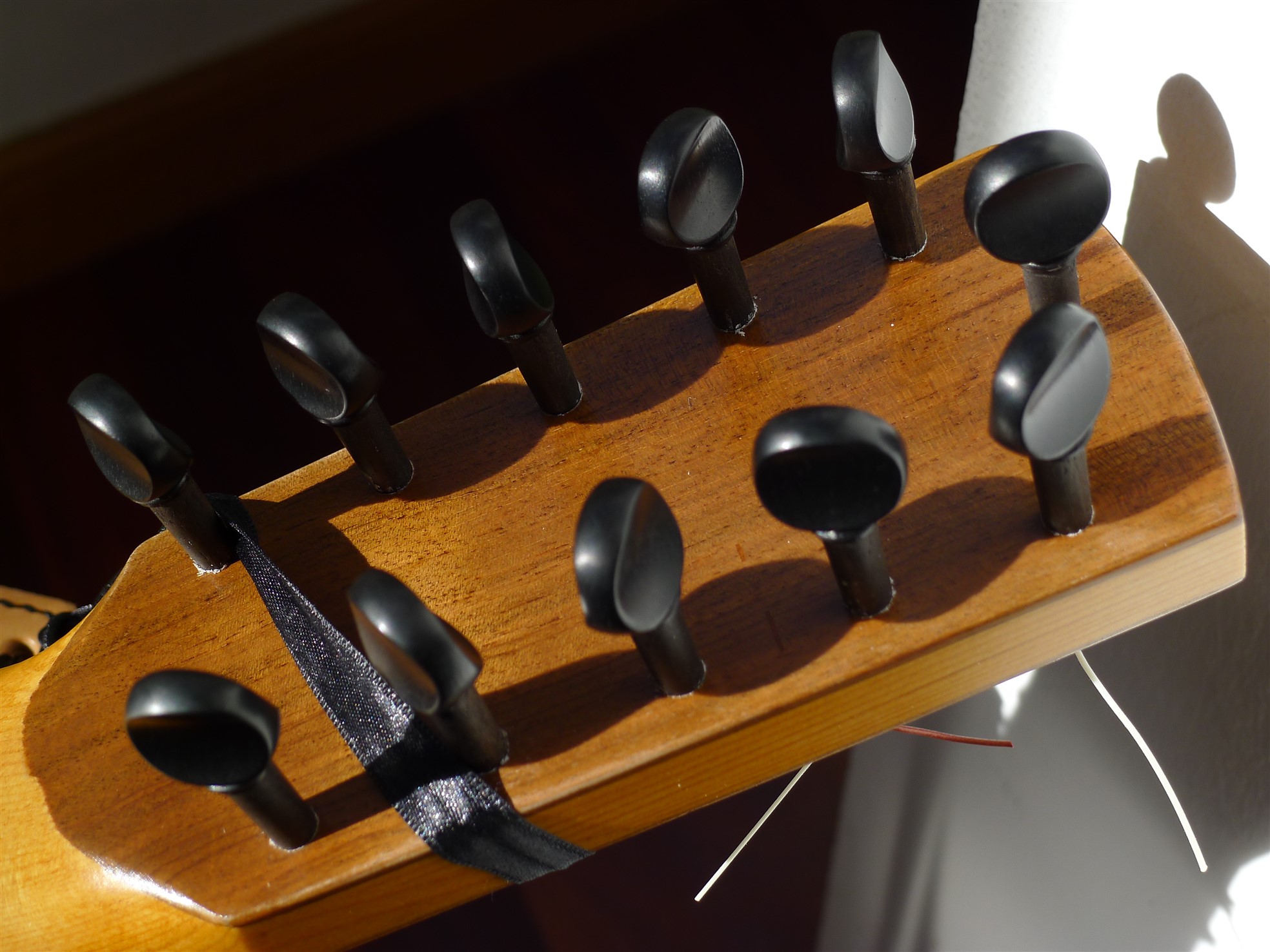 Actualmente, como se ve en la foto superior, he variado algo esta configuración. Para empezar reduciendo la tensión a unos 3.5-3.7 kg la prima y 3.15-3.2 el resto. El encordado es en Nylgut exceptuando el bajo del sexto orden (KF de Alliance Savarez) y el del quinto (Aquila CD). En cuanto a la afinación, ahora está en sol (la 415 Hz).