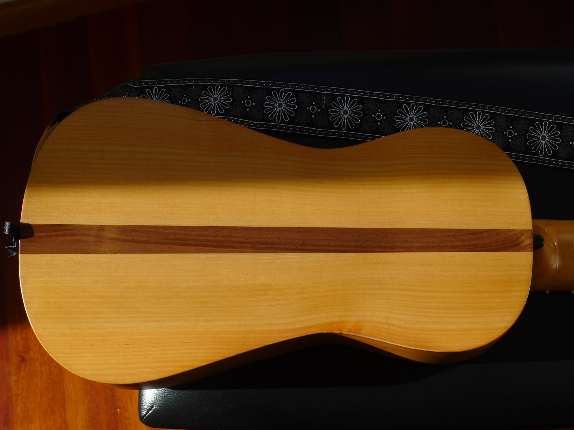 Al principio encordada con Nylgut y bajos entorchados a una tensión de (aproximadamente) 4 kg la prima y 3,5 el resto con afinación en mi (la 440 Hz).