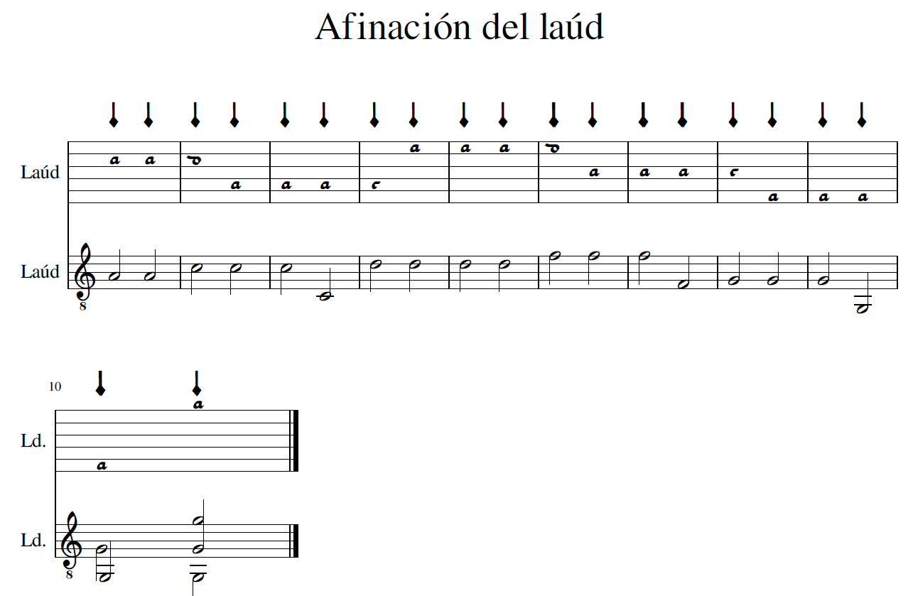Usaré como ejemplo un laúd en sol de seis órdenes, al unísono los tres primeros (G4, D4, A3) y octavados del cuarto al sexto (F3 y F4, C3 y C4, G2 y G3).