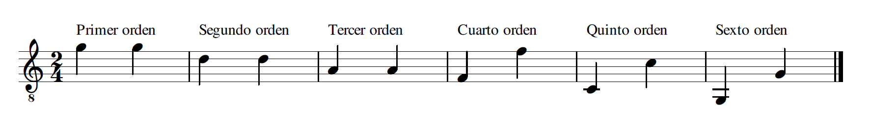 - Y terminamos con los órdenes 1º y 6º. Pulsando el segundo traste del cuarto orden obtenemos un G3 que coincide con el G3 de la octava del sexto orden al aire. Se afinan una respecto a la otra como el paso 3. Luego afinamos el sexto orden y por último el primer orden respecto al sexto.